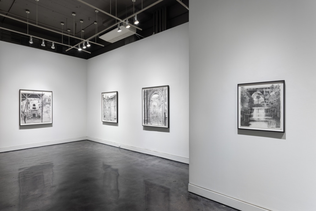 John Moore is widely recognized for his poetic realist paintings blending realism and illusionism to create precise and evocative compositions. In this latest series the artist returns to drawing with an emphasis on tonal richness and textural depth. These drawings feature subjects ranging from the aging industrial structures of Coatesville, Pennsylvania to the coastal shipyards of Maine and the historical streets of Catalayud, Spain. With his characteristic sensitivity to light and atmosphere, Moore transforms these landscapes into meditative reflections on impermanence and change.