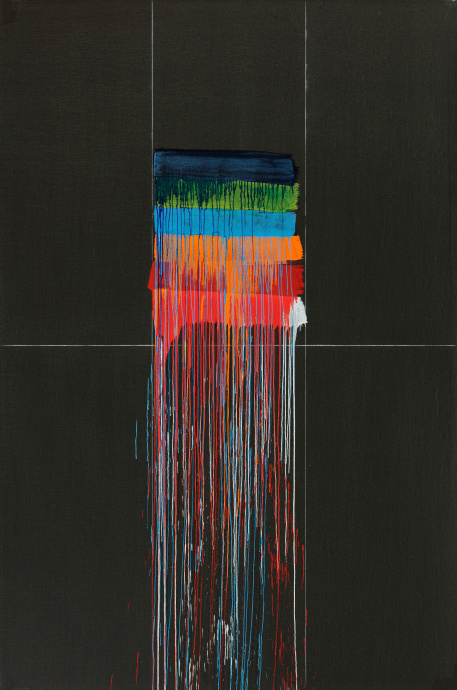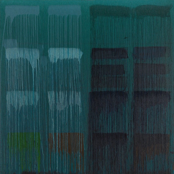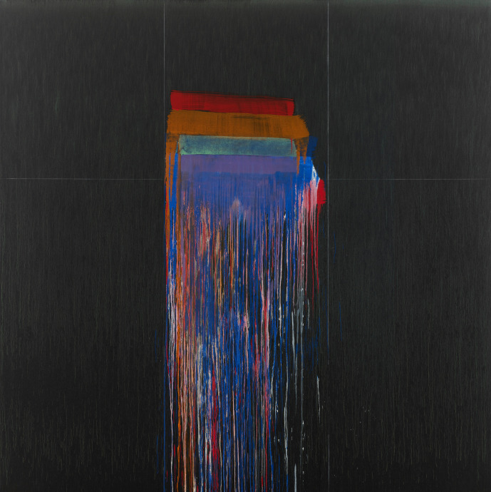 Steir’s new works find her building upon and refining these guiding variables. Against a darkened ground, as seen in Many Colors II (Blue) (2022) and Winter Daylight (2021-22), dripping multi-colored brushstrokes act as prisms within the encompassing layers of poured paint while precise white lines recall her underlying interest in grids and matrices.