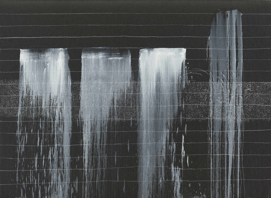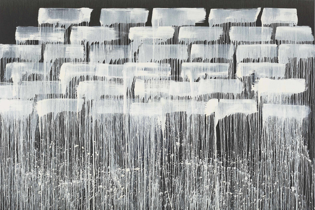 After developing her iconic 'Waterfall' series where “gravity makes the image,” Steir continued exploring the fluidity of paint with various influences from landscape painting and increasingly subtle washes of paint pours. Starting in the mid 2000s, she began making 'split' canvases — playing off of Barnett Newman’s signature style, a process she continues to develop today. Often these works paradoxically evoke a deep space and call attention to their own flat materiality, a product of the systematic series of paint pours and chance-based chemistry. Moreover, this represents her own conceptual interests akin to classical Chinese painting, which embody binaries in order to form a harmonious whole.