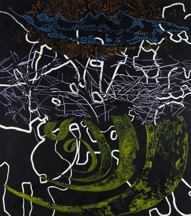 Graves’ earlier paintings from the 1970s (one of which is featured in the exhibition) contain the germinations of a freeform and layered process that came to define her subsequent work. This process involves a loose mapping and esoteric mark-making that combines symbols into an iconography that is both mysterious and familiar. These ideas are further articulated through works that employ actual artifactual references spanning history and cultures. For example, in the painting Evolute (1981), a pointillist profile of the ancient Egyptian queen Nefertiti appears interlaced with coral-shaped configurations and radiographic patterns. In this floating arrangement of marks, Graves creates a visual topography that could also suggest the compression of time and scale as seen through a microscope or telescope.